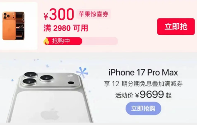 所以苹果也跟了,今天,苹果Apple Store官方旗舰店在电商平台也推出年末降价活动,iPhone 17 Pro及iPhone 17 Pro Max机型全部降价300元,iPhone 17 Pro系列8699元起,而iPhone 17 Pro Max系列是9699元起,另外两款暂时没有降价。